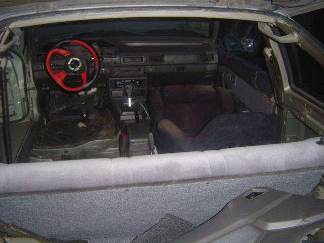 just little patches here and there. Well, the reason we went there is because, I picked up this 1987 Nissan 200SX SE S12 (RWD yo!) with a 2.0, with an Automatic tranny for $275 from a buddy who lives down in Orange city Iowa... pretty fun car, it only has 160k on it. It had some black APC racing seats in it, and some nice nismo 4pt harnesses, and a grant racing steering wheel, a crappy little fart can, some hood pins, and an ungodly large spoiler, bomz intake(probably some ebay crap), aftermarket plugs and wires. He had the passenger window for it, but never put it in. On our way home we passed some junk yard by marchell... Anyways they had a totaled purple 240sx sitting out front,