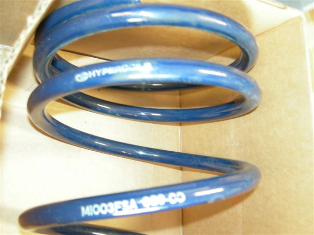 I've got some Hypercoil springs for sale. Hypercoil used to make springs for Indy cars. I bought these brand new a few years ago. I put them on to replace some horrid cut springs that came with my car. I didn't think they helped, so I bought Sportlines. I put those on and it felt exactly the same. The struts were shot. So I put on AGXs with the Sportlines. And that's how it is today. So these springs have less than 500 miles on them. The car sits lower than stock (between the Pro-Kit and Sportlines) and requires camber kits. I'm looking for $90 obo for the set. PM me if you are interested.