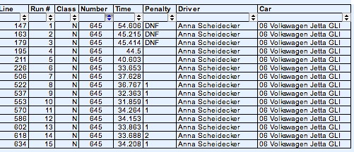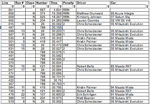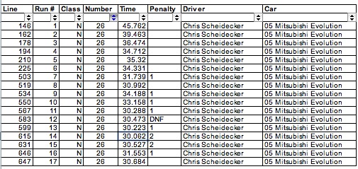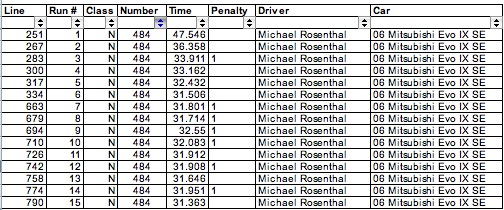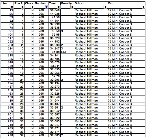 Yeah Rachaels are messed up cuz our friend got there ready to drive his C6 vette and when he pulled into his parking spot after tech noticed that his front tires were cored on the inside  .... so we offered up the mini so he could still race. We messed up and didnt switch numbers around... oh well ... i think its split like this ... 1-9 Spiegs 10-17 Rachael 18-27 Spiegs 28-37 Rachael. But i think some of his runs didnt get counted in the mittle there somewhere.
