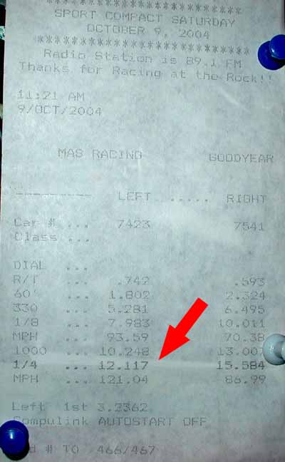 Went to the Import day at Rockfalls yesterday and I finally hit 11s. I ran an 11.53@122.53 with a 1.73 60ft. Tried again for a second time and I missed 4th gear and ran an 11.8 @ 115. I got my best 1/8 mph it was 96.34, but oh well ... As the day went on, it got hotter and hotter and the track got crappier and I ran another 4 more 11.8s and decided to call it a day and go home.