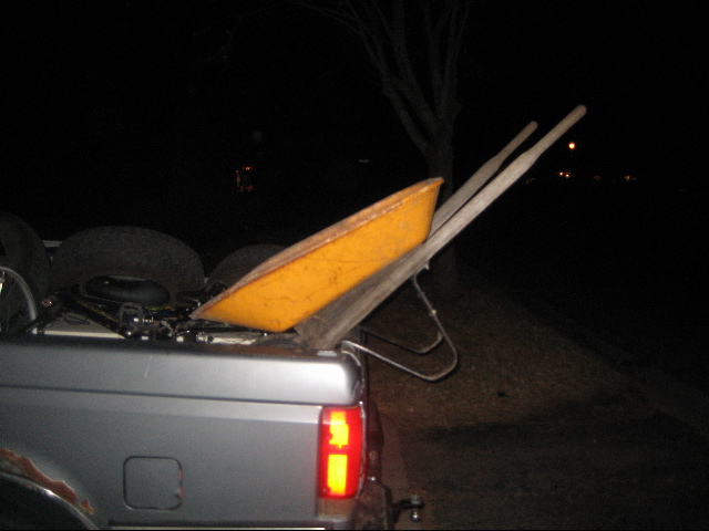 On top of the pile is my moms wheel barrel, we are leaving his parents house over by the MG high school, we come to an intersection right in front of the school, we need to go right.