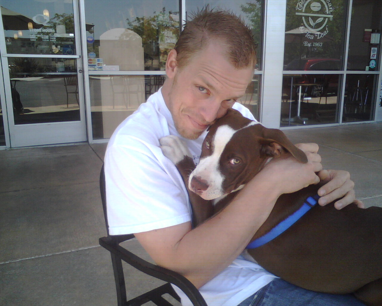 His name is Dissem (aka DSM sounded out). He is the mostly brown American Staffordshire Terrier (aka Pit bull.)