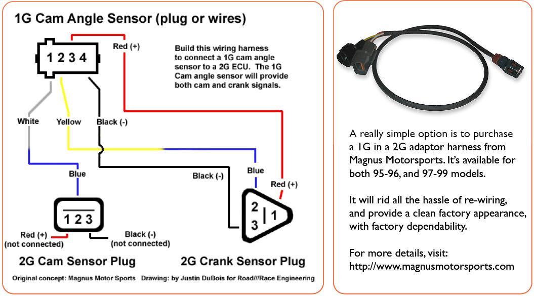The 2g crank sensor is triangle and the 2g cam sensor is a rectangle, both have 3 wires. I would buy the converter from magnus or RRE, it's worth the $75. I rigged something for a week but I eventually bought the nice adapter plug. If you want I can give you the one I made for a few bucks, I have no use for it now.