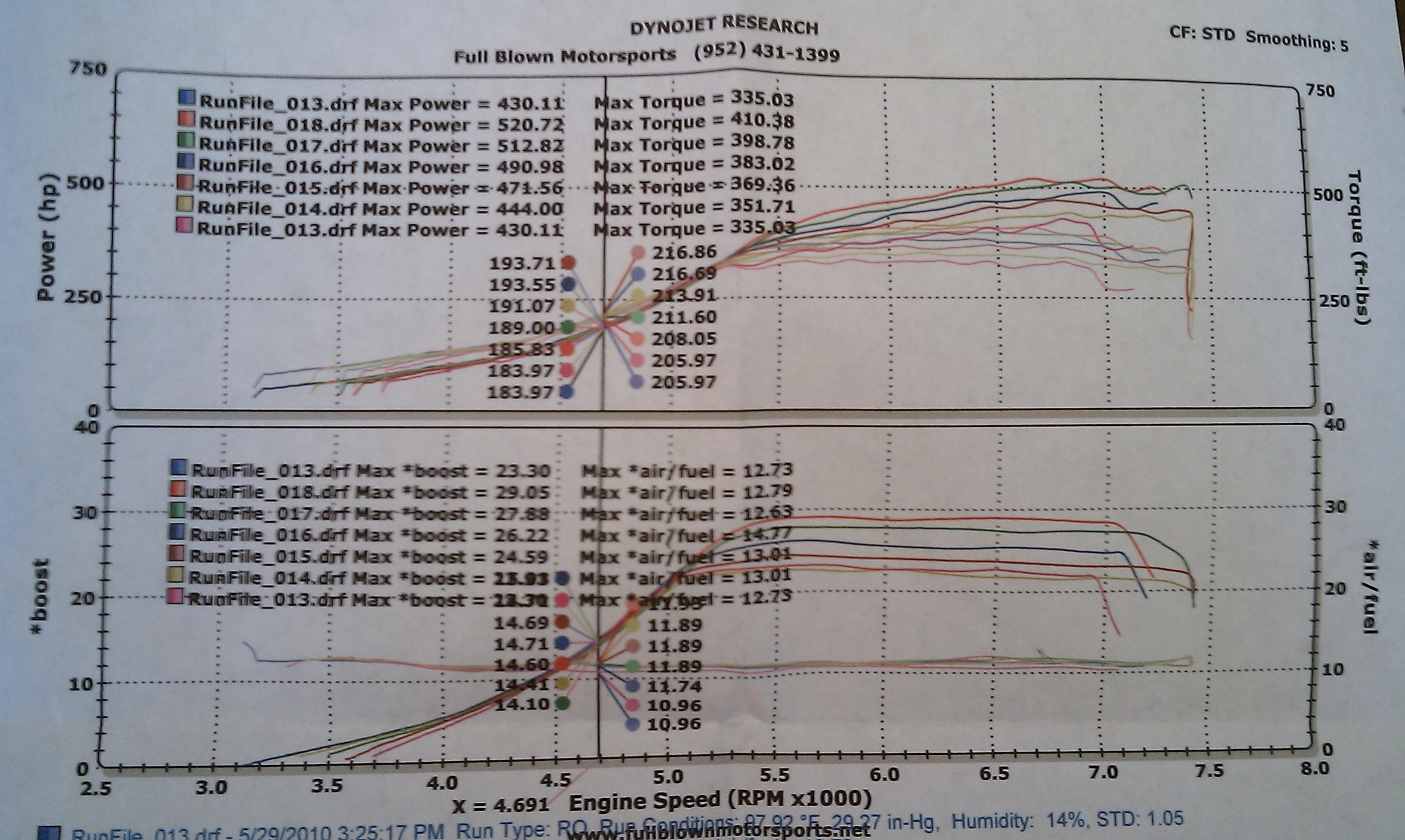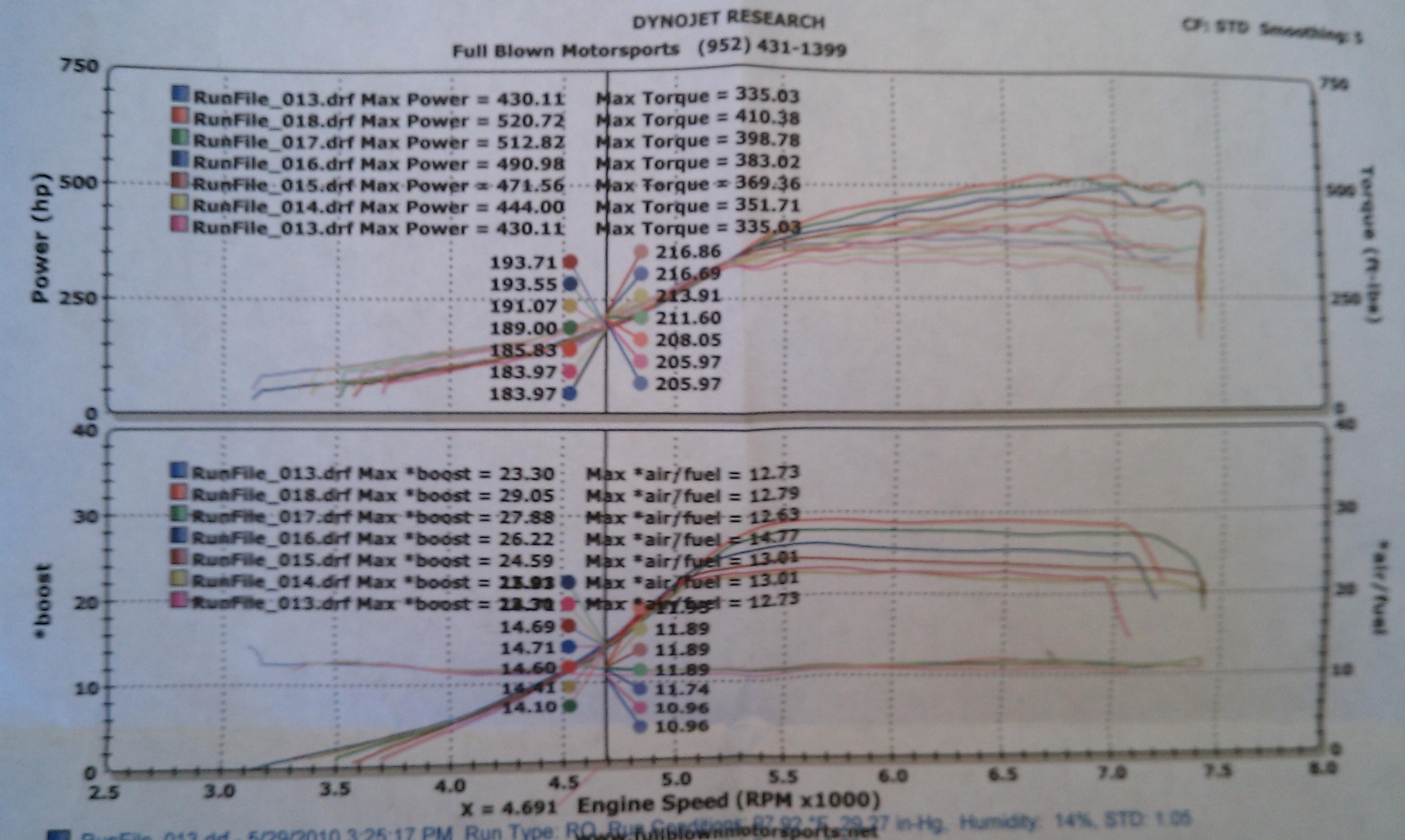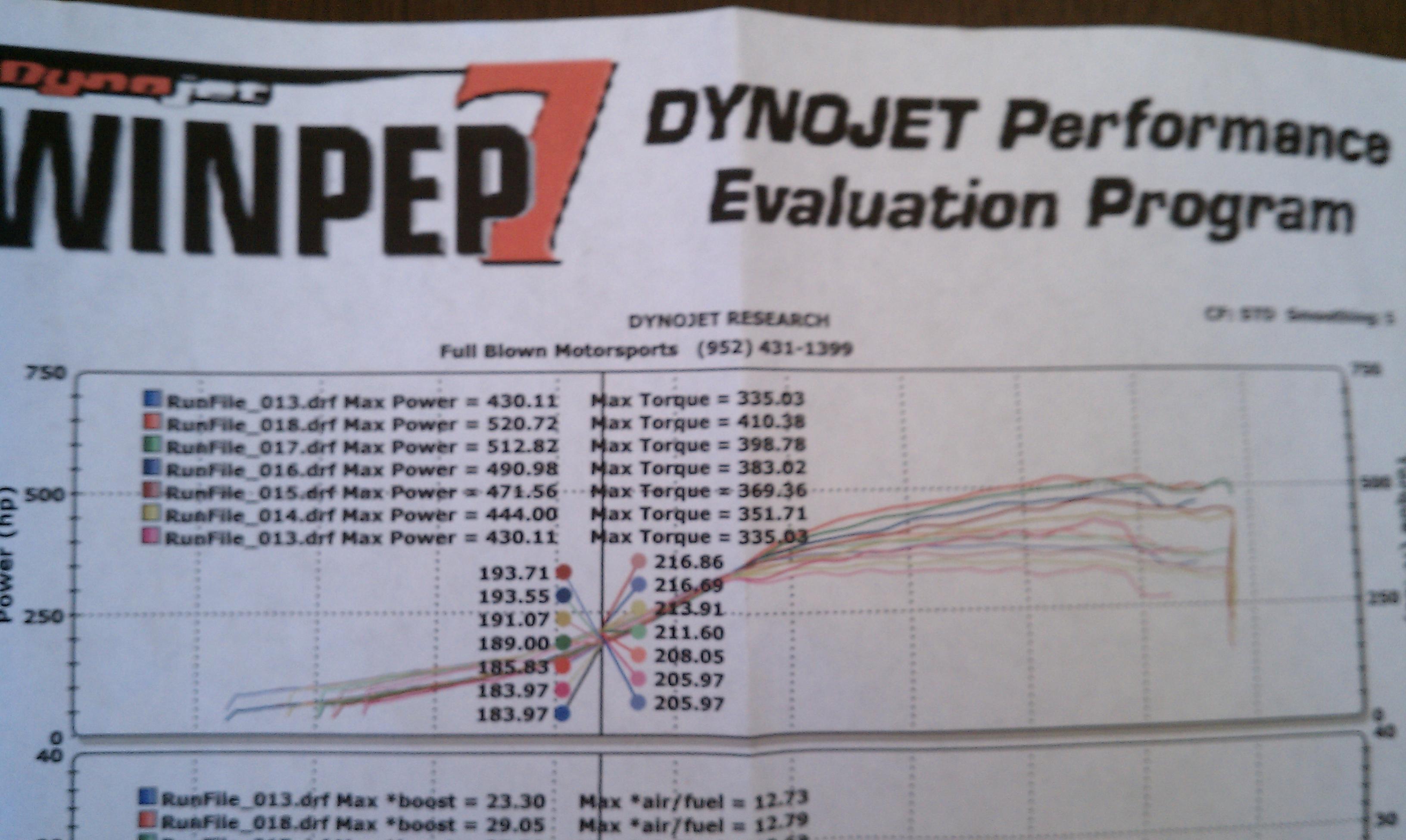 Since Ross hasnt posted his time slip I am just gonna go ahead and let everyone know he made 520hp/410ftlbs at Full Blown on 29 PSI.