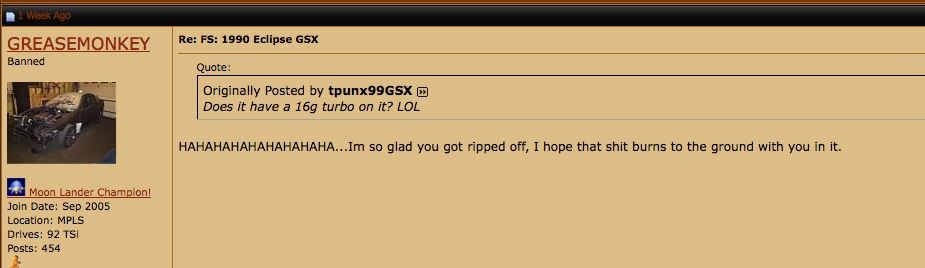 Just so we're all on the same page, GREASEMONKEY sold tom his car, jerked him around, lied about the parts in the car, and now apparently wishes him to die a firey death. As you know, we don't stand for physical threats around here, so TOM I'm leaving this up to YOU! 1 week ban? 2 week ban? 3 month ban? permaban?