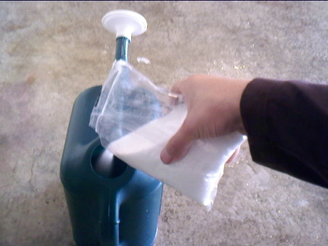 Couple pics showing the acid going into the flower watering jug. Then a pic of the half of the garage wet with the etching acid soaking in for a little while.