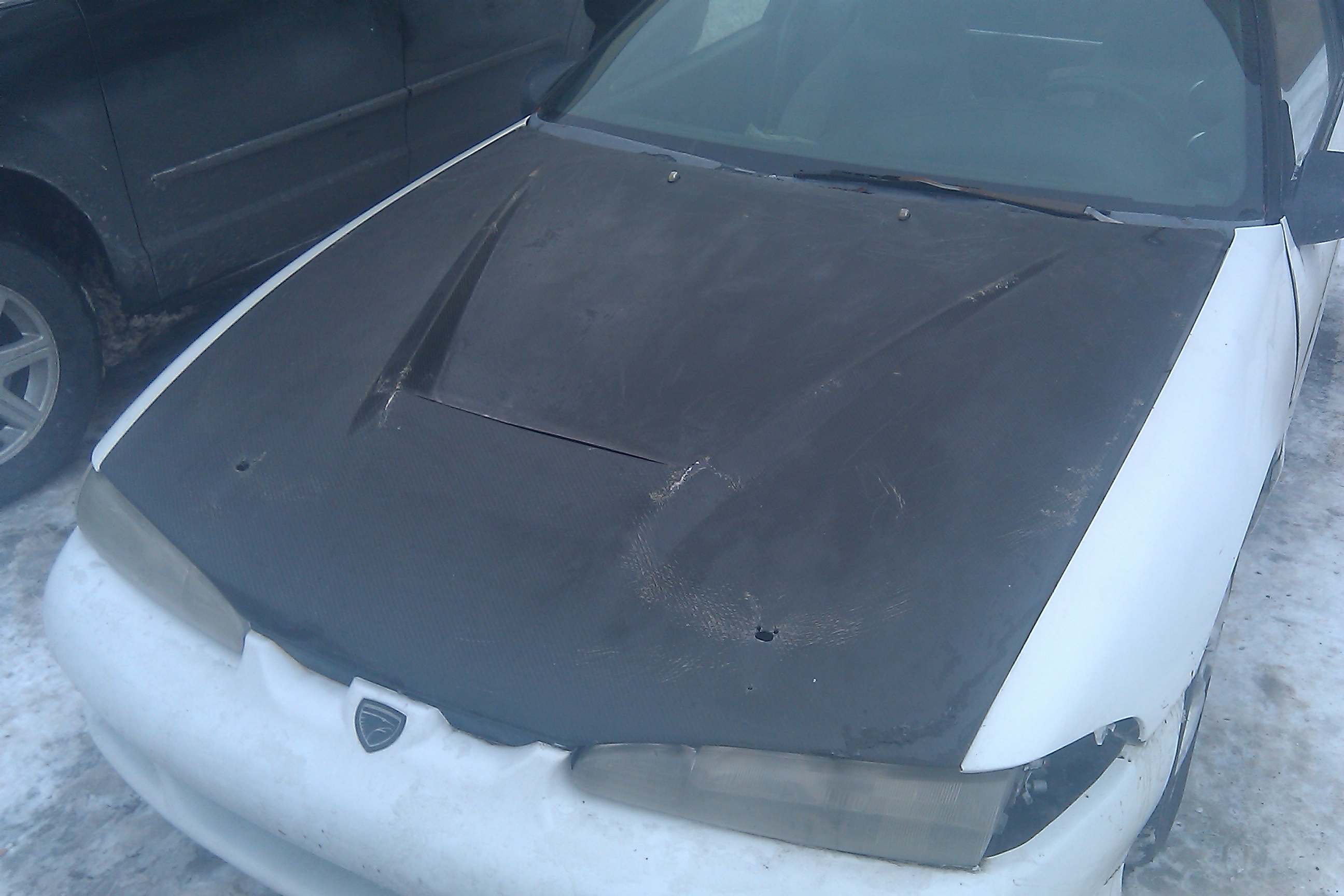 So I just bought this car last night and it has q CF hood on it. The hood is in pretty crappy shape, basically there are a few stress spots where the clear coat on the hood cracked and peeled. And where the vent is on the hood the corners are pretty beat up. Also there are 2 hoodpin holes drilled in it.