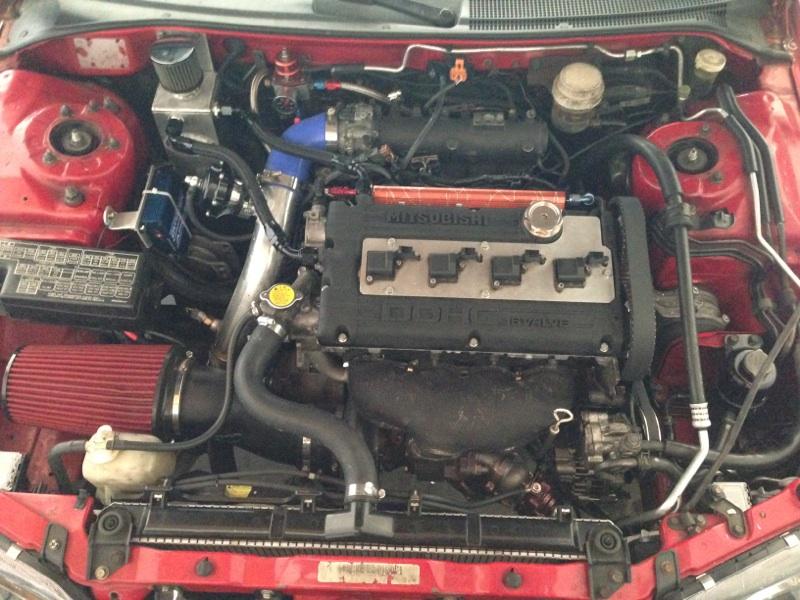 FMIC, 2.25" IC piping, Tial BOV, Evo III Intake Manifold, 1G NT throttle body, FP Race exhaust manifold, HX35 w. BEP bolt-on turbine housing, Punishment Racing 02 housing converted to v-band, 3" SS downpipe, 3" SS exhaust, Bosch 2000cc injectors, aftermarket fuel rail, Aeromotive AFPR w/ gauge, Race Parts Solutions in-line SS fuel filter, SS fuel lines, Walboro 450 E85 pump, Buschur COP with Dynatec ignition box, Fidanza cam gears, FP 4" intake, Tial mvs 38 wastegate, forward facing oil filter housing, crushed water pipe welded at the end.