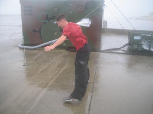 Most of these pics are in like 60mph wind, because we couldn't bring camera's out in the 100+ winds because they woulda got ruined. But here's all of us making rain suite to go out into the 100 mph winds. We still got drenched. Just imagine driving down the freeway at 100 with your hand out the window when its pouring out. It hurts a little, and imagine it hitting all over you body. It was freakin nuts. The chubby dude in grey actually got blown over when he first walked out the door because he wasn't expecting it to be that strong! BTW, those rain suits we made didn't do shit!