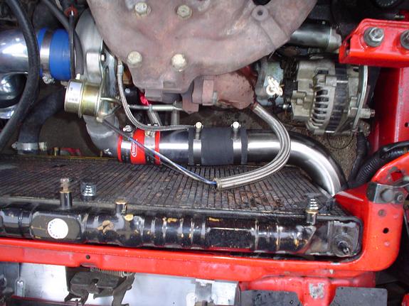 can you re-index the compresser cover and run the IC pipe closer to thge radiator? and run a 90 into the Intercooler. Kinda like this