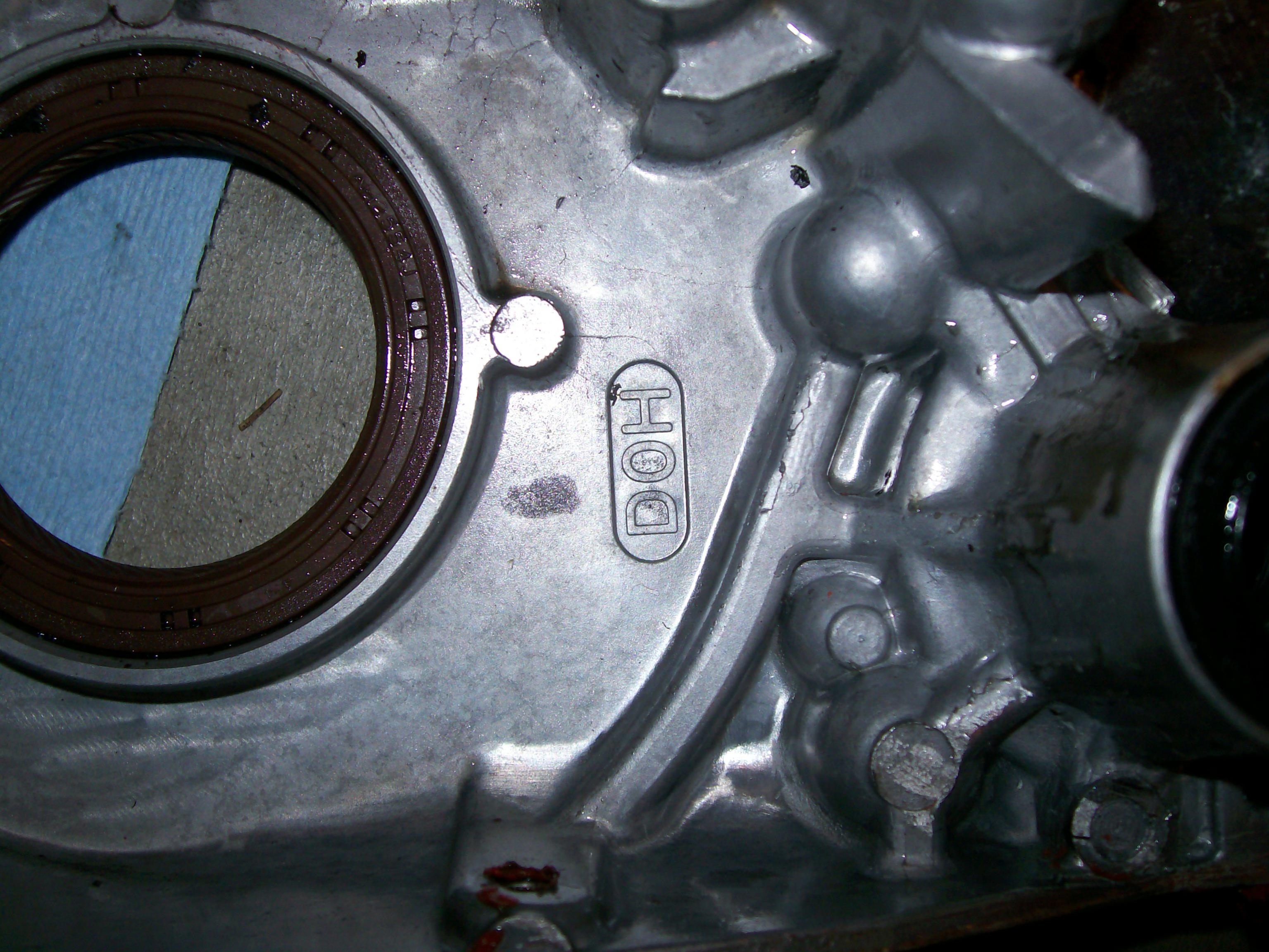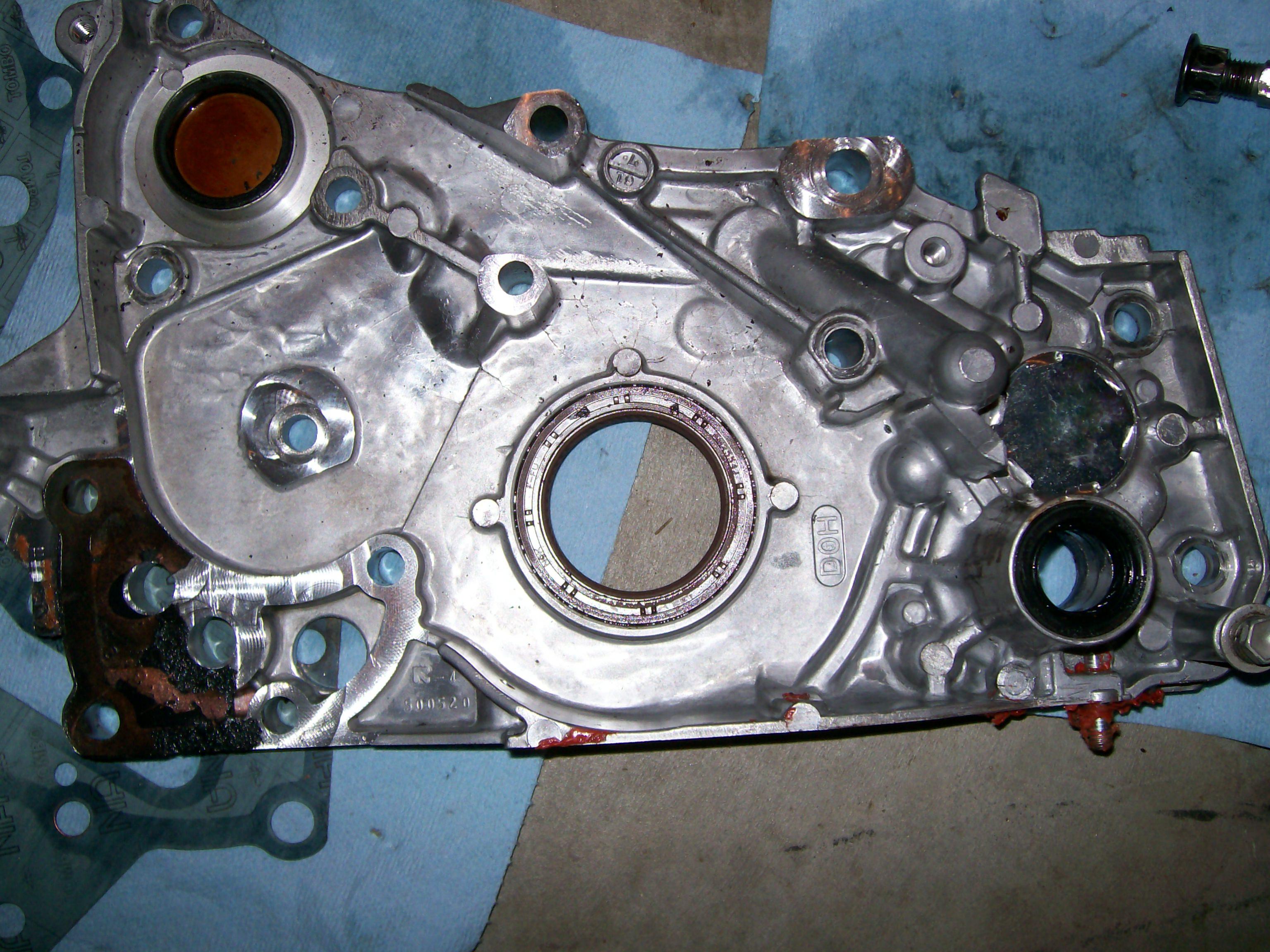 Here are the pics of the front of the cover. And the pic of the brown seal is the original seal. I replaced it yesterday with a black one that I had laying around (new) to see if it still leaked. That was before I took the pump off the block to find that it was messed up.