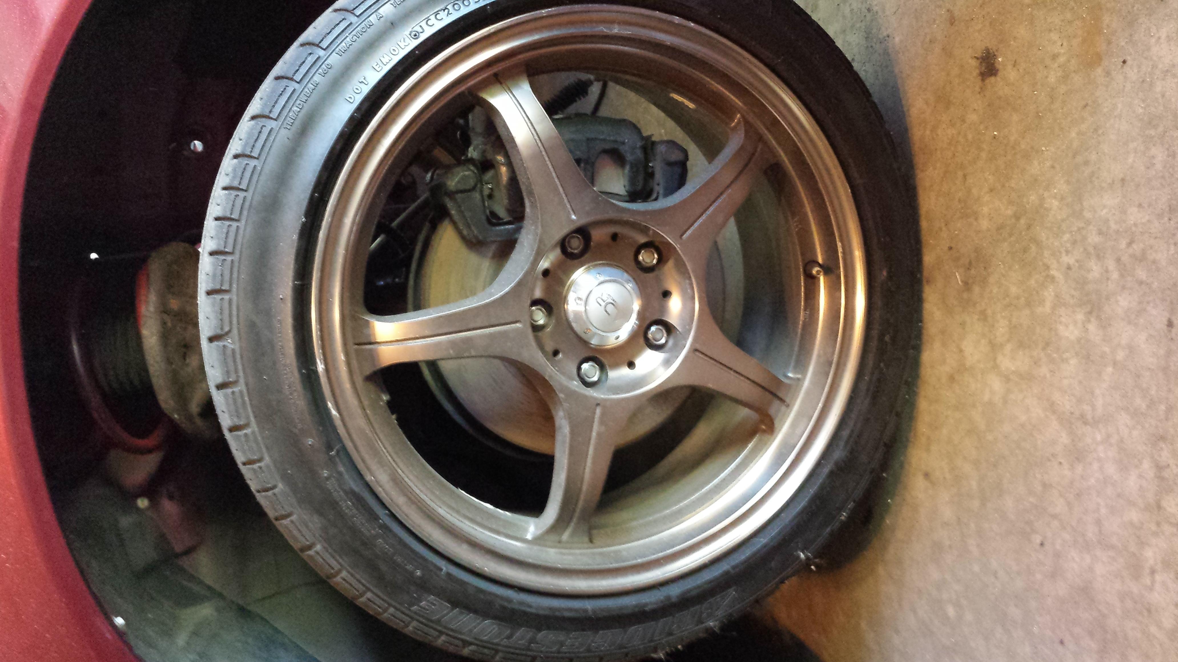 they are 17x7 or 7.5, tires are 235-45-17 but only have about 5/32 on all 4