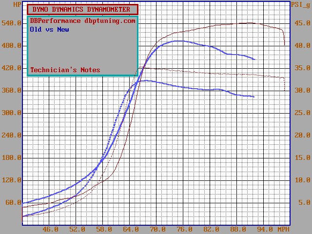 Dyno chart is a comparision of the old horsepower/boost versus the run before the tranny let go.
