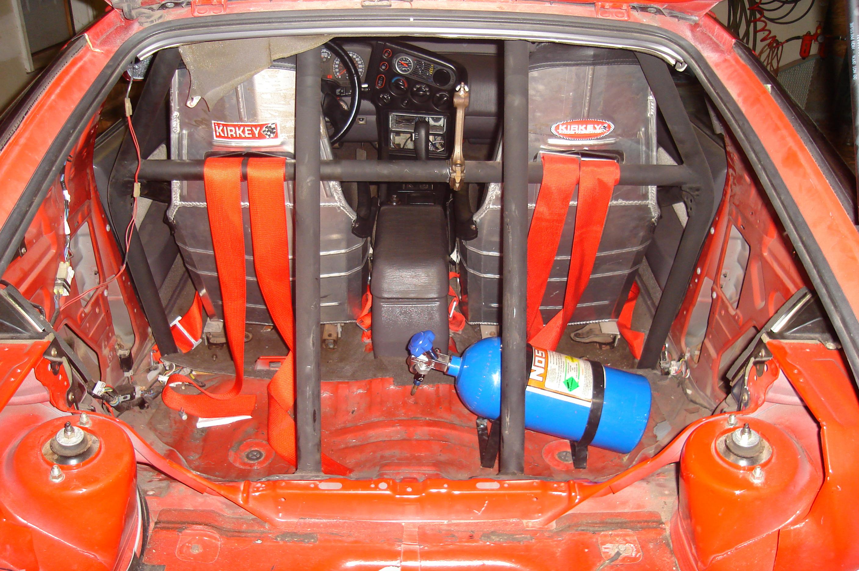 2:00 AM progress update. I got alot done today. I got almost all the wireing except for the nitrous buttoned up. I got the cooler installed and plumbed, and Radiator back in. Got all the interior back in (even got my cigarette lighter working for laptop charging etc.) And I got the nitrous bottle mounted and line run to engine bay. Not mutch left to do till its driveable.