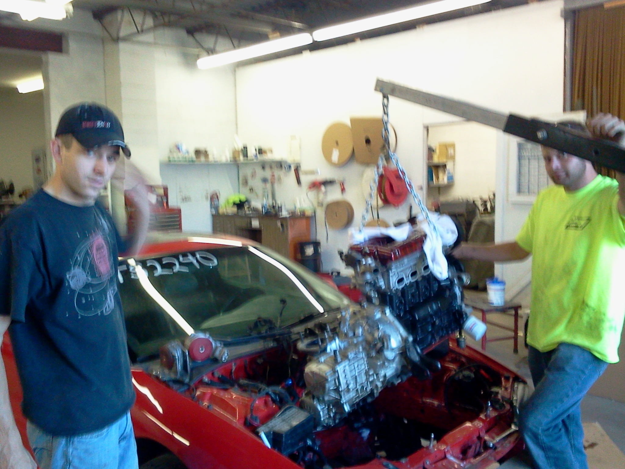 got alot done. got my driveshaft, oem shifter, and 3rd diff mount after finding mine was completely shot...engine, trans, and transfer are now in their home goes toi easy with three guys getting the engine with trans mounted in the bay... need a few bolts that i cant seem to find to keep rockin out. turbo should be here late this week ir early next weej...