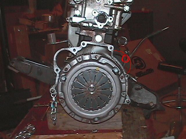 Also, I noticed the shape of the two blocks is a little different where it meets the tranny. I have a bolt leftover, and it looks like there is an extra bolt spot on a 2g that's not there on this one. The right circle in red is what I'm talking about. On the 6 bolt it seems like there are only 3 bolts to hook up, and on my 2g there were 4. In the clutch picture I drew a red line where my 2g starter plate is bigger than the 6 bolt one, and also a circle where that extra bolt would go. I also noticed a couple holes on the left (next to where the starter goes, where the left circle is in the first pic) that don't seem to go to anything... I should have taken more pictures when taking it apart.