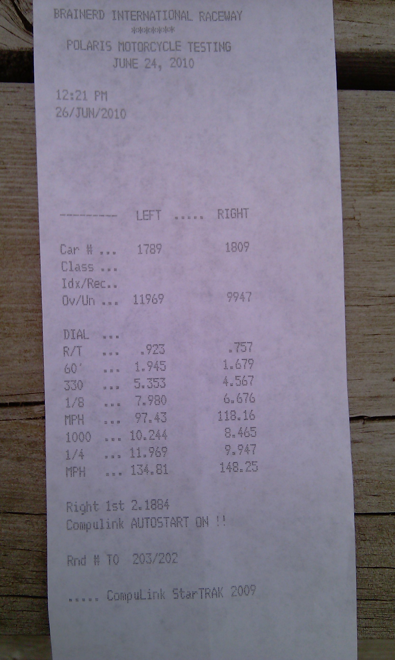 This has been an awesome test and tune session for me. The first pass was 10.2 @ 152.5. It bogged on the second pass off the line. The third pass was 9.9 @ 148. I was warned to slow down. I hope to improve the 60 foot tomorrow!