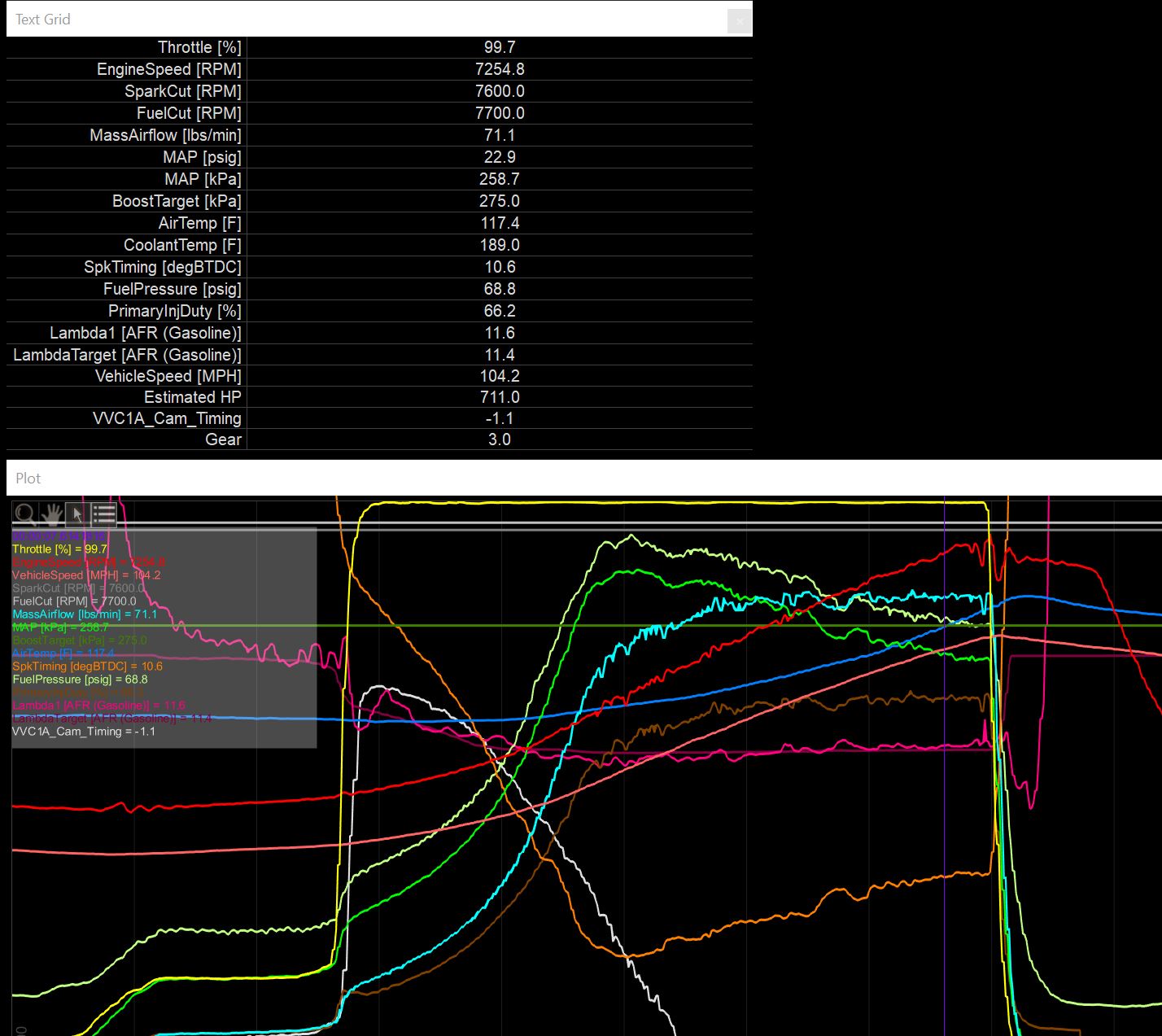 AEM shows a 710hp estimate. For comparison last year when I made 709hp @ DB, AEM estimated roughly 630hp. So a 70-80hp difference then, so if it's similar on the new setup that means I should be somewhere around 780ish or so. We will see, someday I'm going to get it on the dyno.