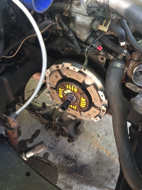 Last night after work I pulled the trans. This morning I changed the clutch and reinstalled the trans. With the lightweight flywheel, six puck disc, and without a welded diff/EvoIII parts it is definitely different to drive. Still got to break it in though. Now I'll have to start setting aside money to fix my main transmission.