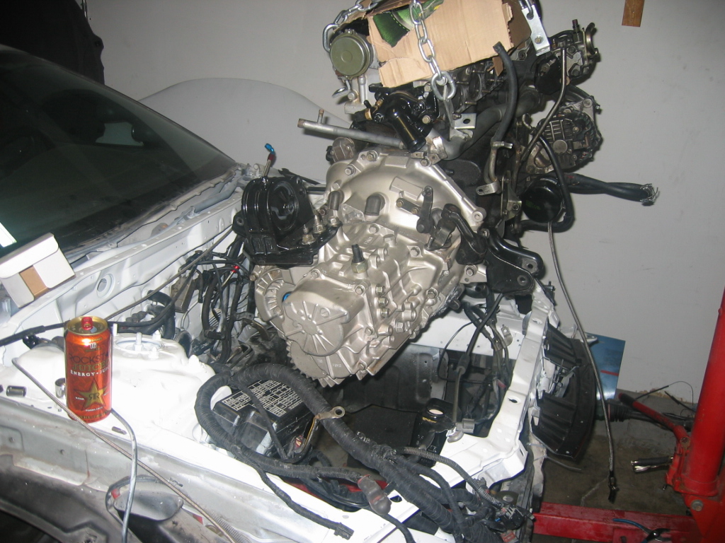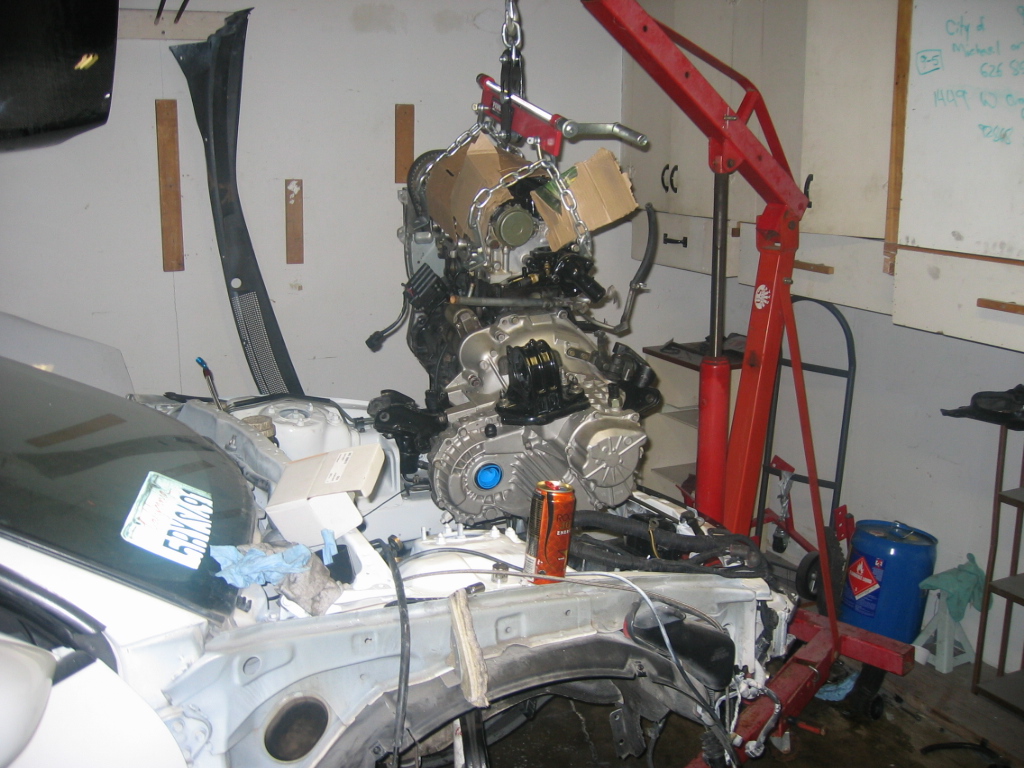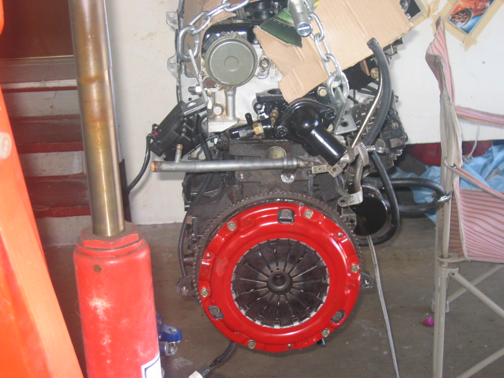 Ok the motor is in, but there is still much to do. It seemed like it was going to happen today but with the late start because the clutch still needed to arrive before starting, and with my roomate being gone for a couple hours. I ended up getting the engine in the bay and almost in all of the mounts by myself, my roomate arrived just in time to help finish getting everything lined up.
