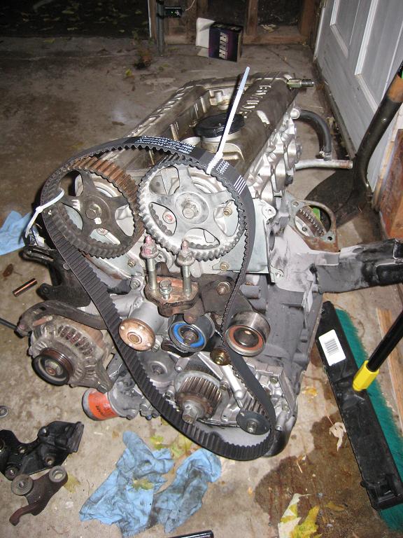 Ok, much more progress today. I got the alternator and power steering pump on the new motor, got the cams installed too. When I got the valve cover off the old motor everything was really yellow inside, not much silver that I could see. I had to use the hydraulic lifters out of my motor and put them in the new one. All that is left now is to get the timing belts done and bolt on the transmission, then it will be ready to be put in.