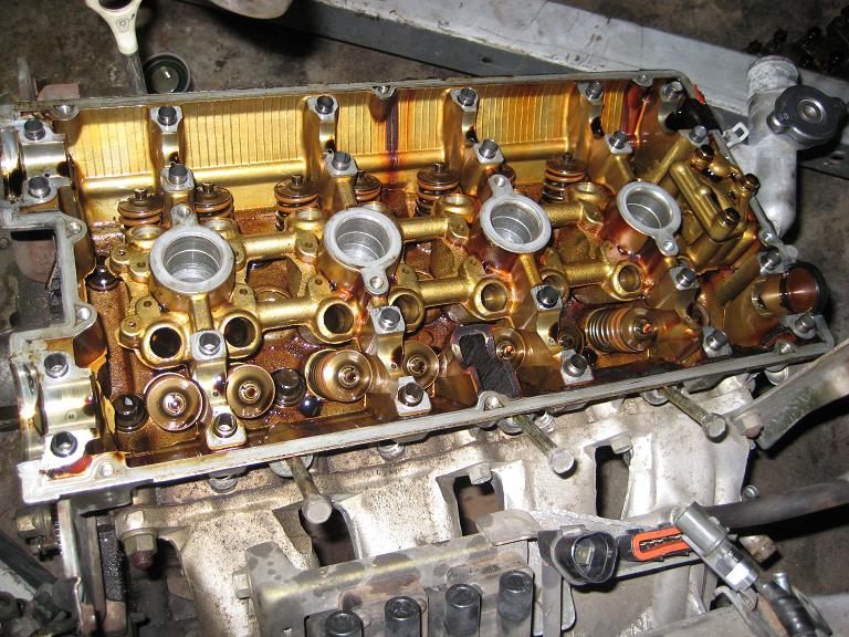 Lastly I included a shot of the new motor with the valve cover and cams on, and also the old head that looks like it's made of copper.