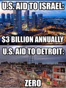 Saw on facebook a perfect example of this yesterday. Was a picture stating that we give 2 billion dollars a year to Israel (shows a pictures of its gleaming city) then at the bottom it states that we gave Detroit "0" money last year and shows a picture of the state Detroit is in.