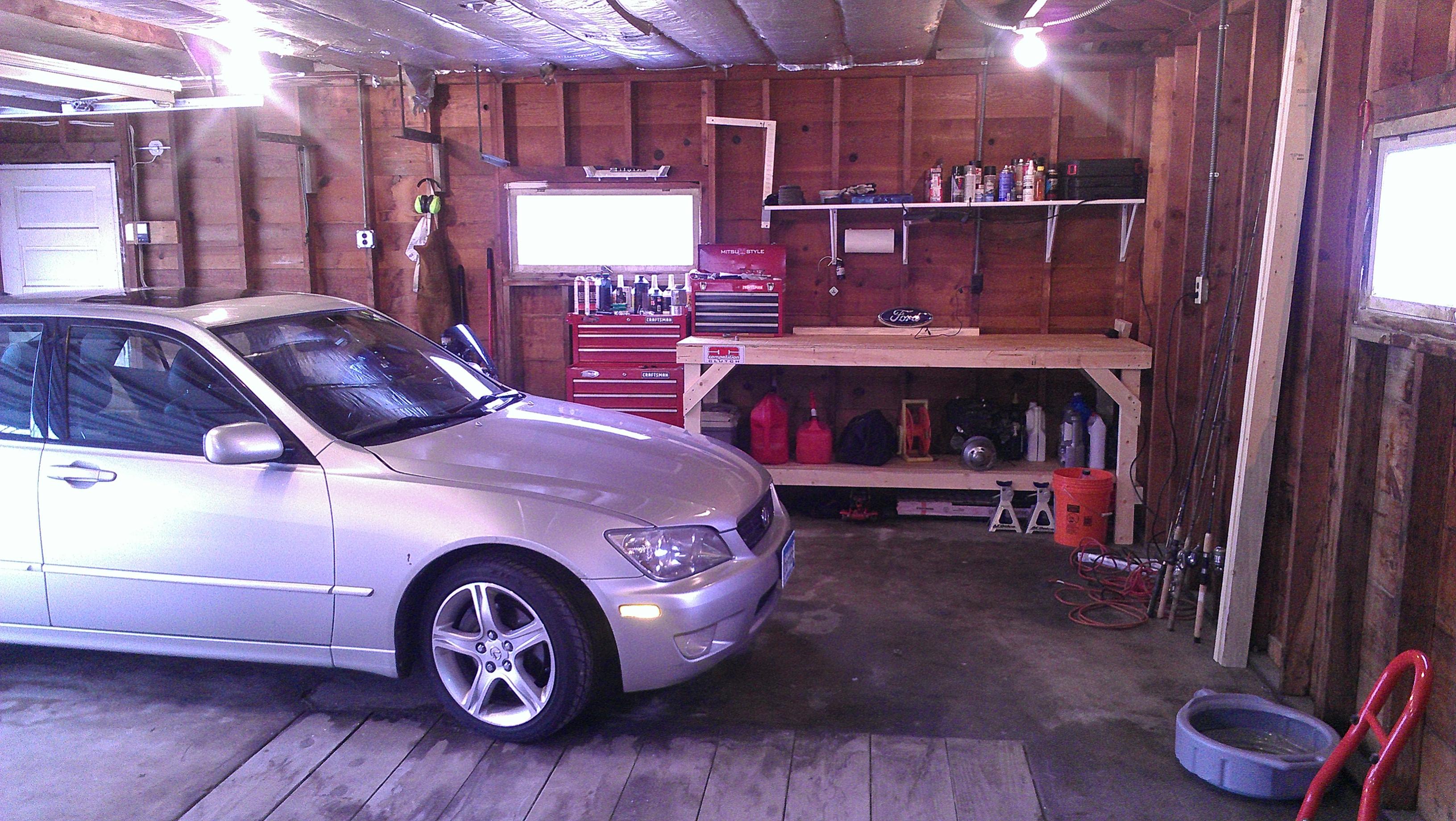 A few weeks ago I built a work bench for the garage. It's 8 feet long and 30 inches wide. The bottom shelf is 18 inches wide. It's nice to have a garage big enough to park my car inside and have enough room to work on the bike infront of it and still have the door closed.