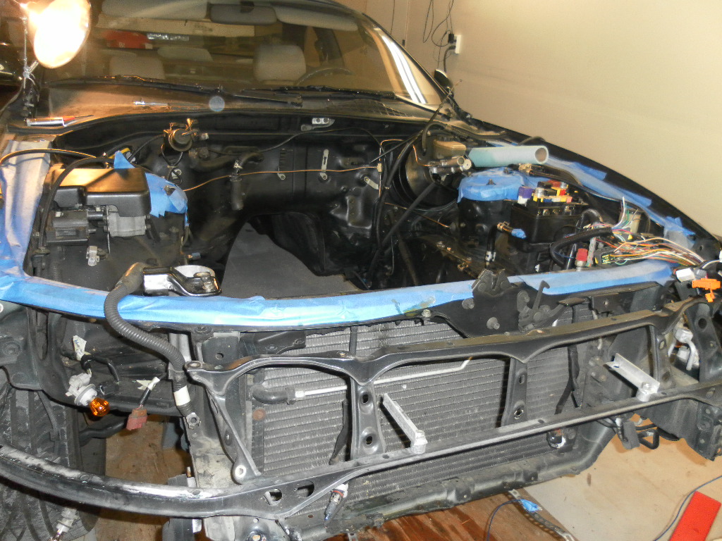 Well got about a 2hr start on it today. Got the oil, coolant, and PS fluid drained. Got the work area taped off since I know it's going to become a tool rack and I'd like to keep the paint as nice as possible. Got the front bumper removed, FMIC and piping removed, bunch of stuff unplugged and labeled. Slowly but surely is the way I work now-a-days  Leaving it like this for the night, will hopefully get another couple hour crack at it tomorrow!