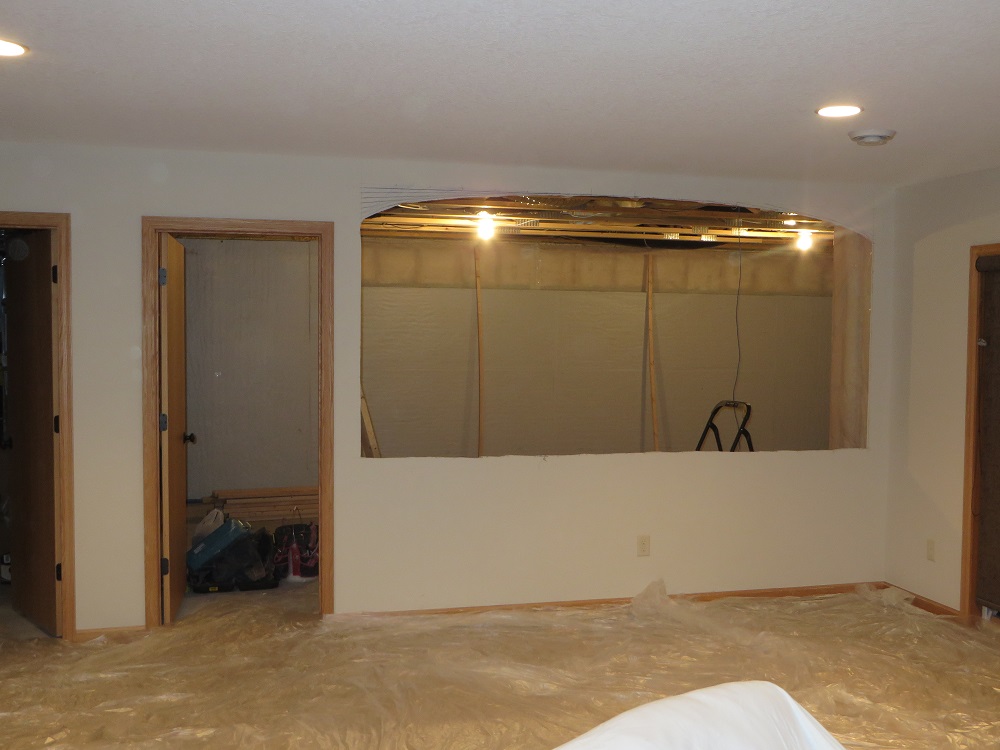 Small update for today. They got the ceiling studs done (ceiling had to come down a hair). Beefed up the half wall for the bar top, and put up some plywood for the archway. Also the Benq and mount showed up today from Amazon.