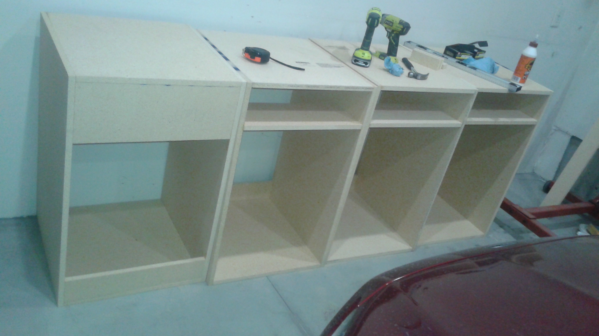 Round 2 of the cabinets has started. Went over to supra dudes house on Sunday and cut up 4 more sheets of wood. This should be enough to do all 4 tall cabinets, and almost enough to do the ones that go on top of those.