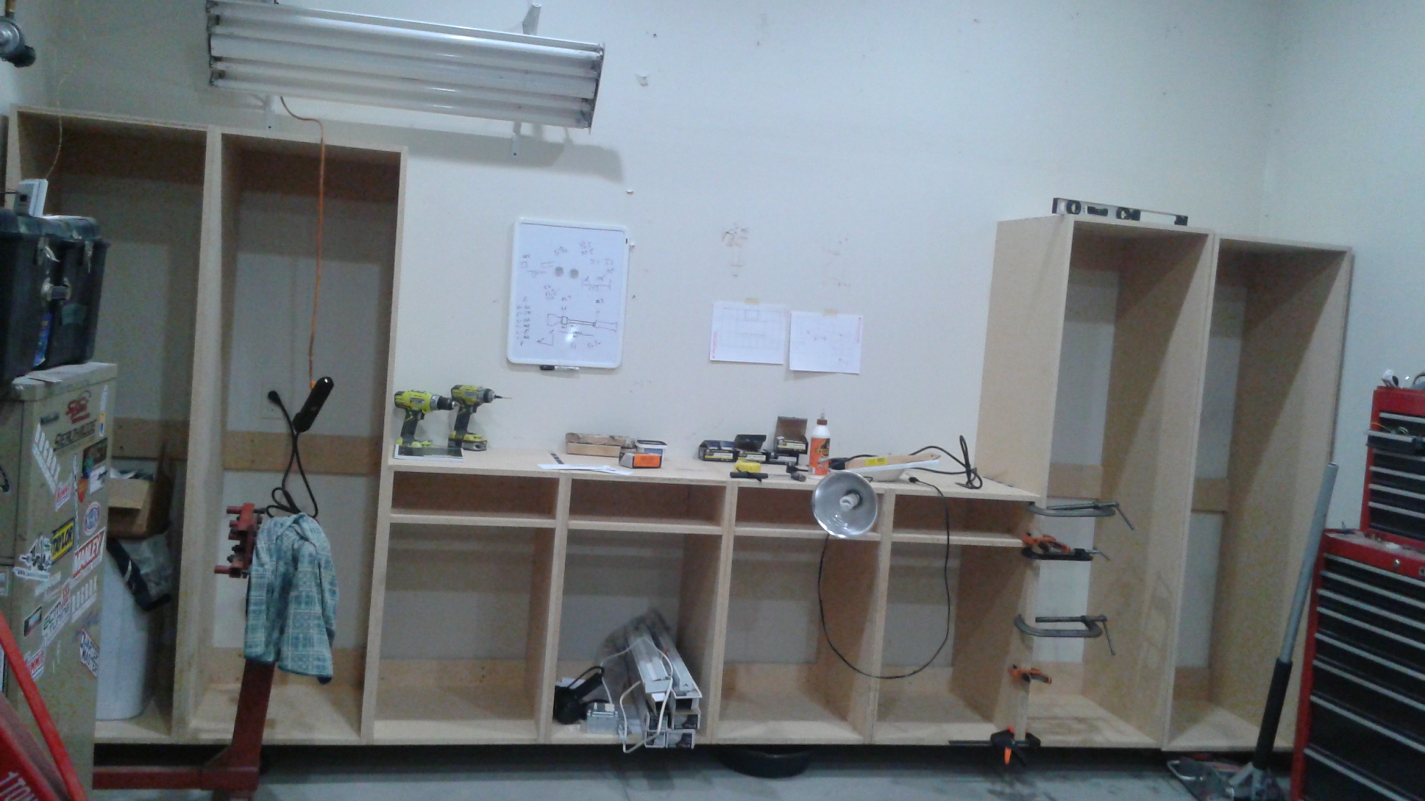 Phase 2 of garage mods have started. So with the help of Jeremy (supra guy who lives only a couple miles from me), we came up with these final plans for a cabinet arrangement on my back wall. So I took down all my old shelving last weekend on that wall, moved my work bench over, so I'm basically ready to start.
