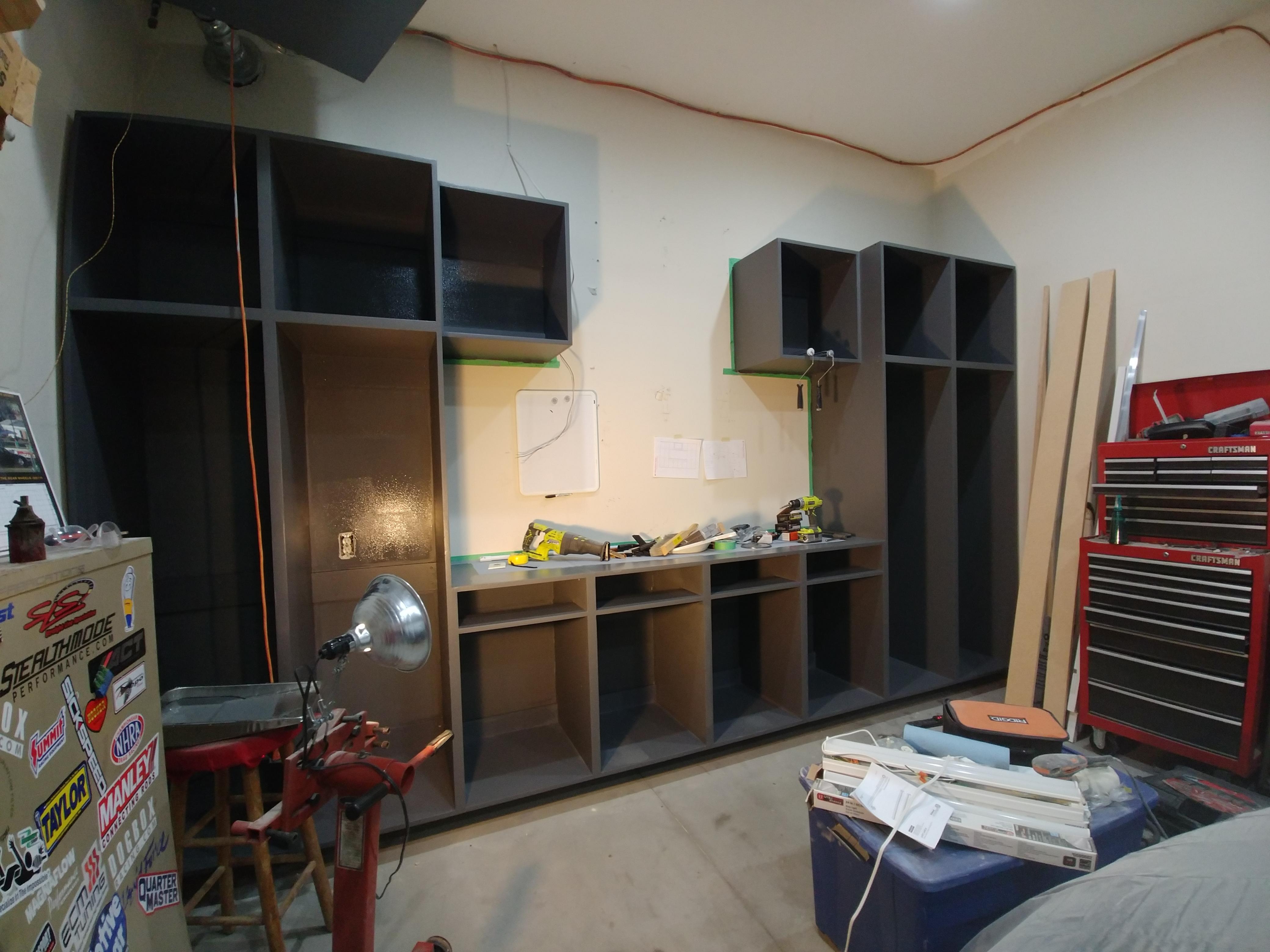 Painting on the casings is complete. Went with a dark grey semi-gloss. Pretty happy with it. Now to start adding shelves.