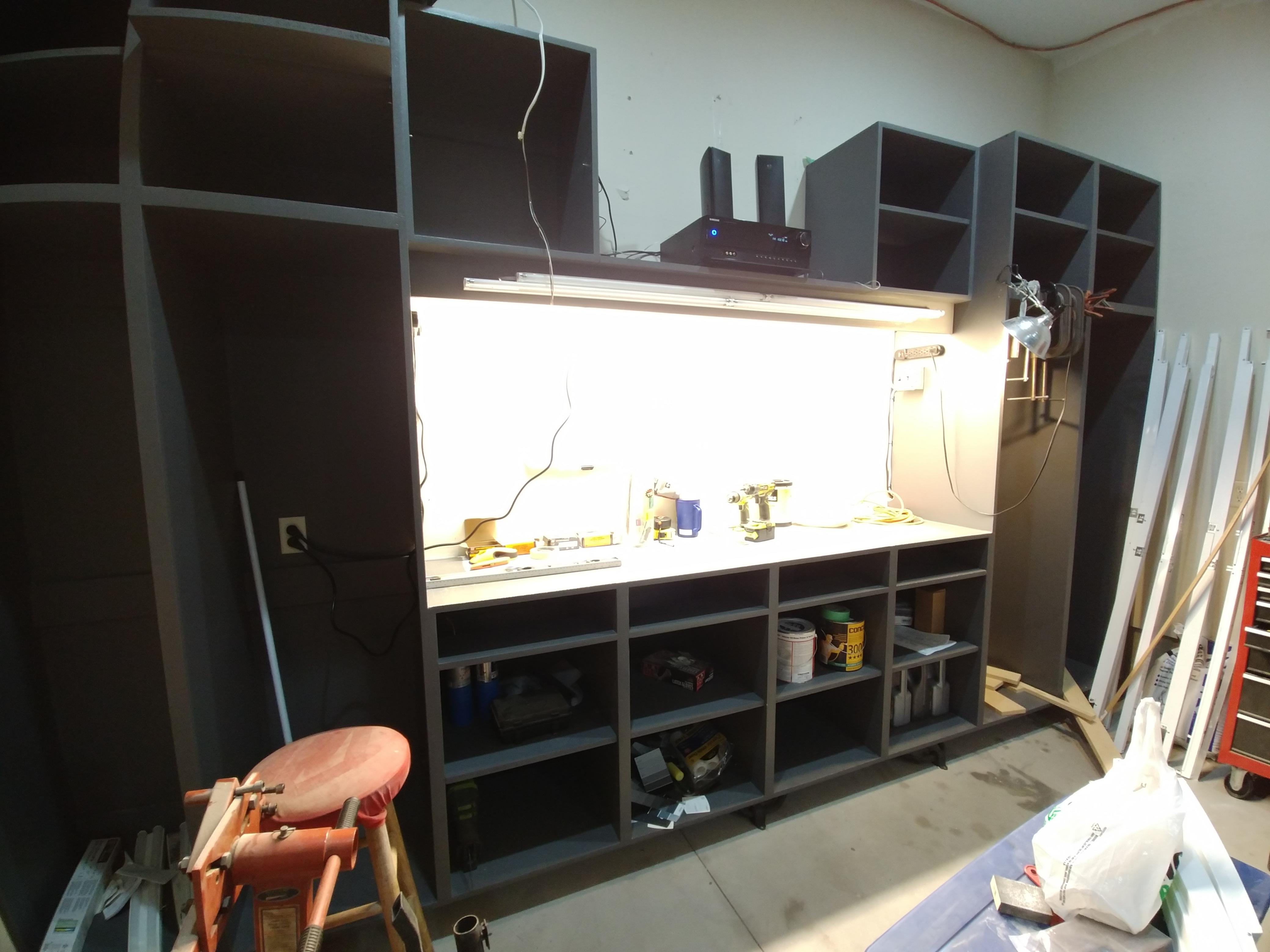 Been working on electrical lately. I have power strips mounted. I have the t5 fixtures mounted. One underneath to light up the work bench surface, and one mounted to shine towards the car for imoroved under hood lighting. Each on their own switch. Still buttoning up that wiring. Also i bought 4 in ceiling soeaker from monoprice ($35/pr). Have our downstairs receiver land sub out therr for testing out. I also bought a used 8" 150w sub off ebay (same as the one im testing out). Hopefully get these ceiling speakers mounted and wired soon. I can fit a max 43" flat screen on the shelf, so im just keeping an eye out for some kinda smokin open box deal at best buy for a 40-43" smart tv (hoping for something around $150).