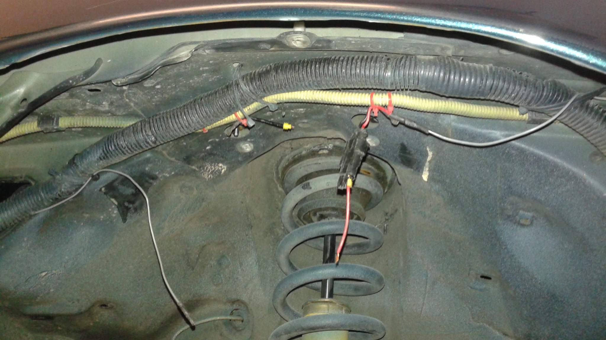 Coolant is refilled. I tested the fans by jumpering 12V to them and they work. I decided to just go ahead and replace the relay that turns them on just in case it got damaged. I started the car, car runs and idles great. As it was starting to get up to temp, I was walking around inspecting things, then I noticed the wiring in the wheel well. What you see in the pic is the black and yellow loom that is the OEM wiring that used to run in the engine bay that I tucked up in the wheel well. Then also my single control wire (and connector) that goes from the fan relay to the Infinity ECU to trigger the fans. When the wheel hit the curb, it must have came up and hit this area and basically ripped that connector apart and left it dangling there. So easy fix, grabbed a new connector and repaired it and tucked it back up there.