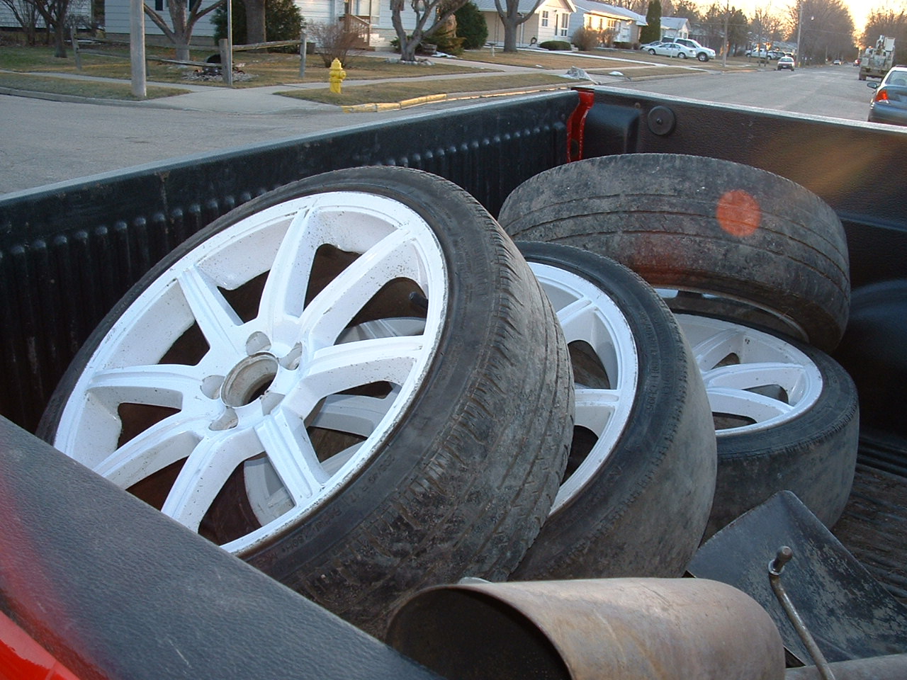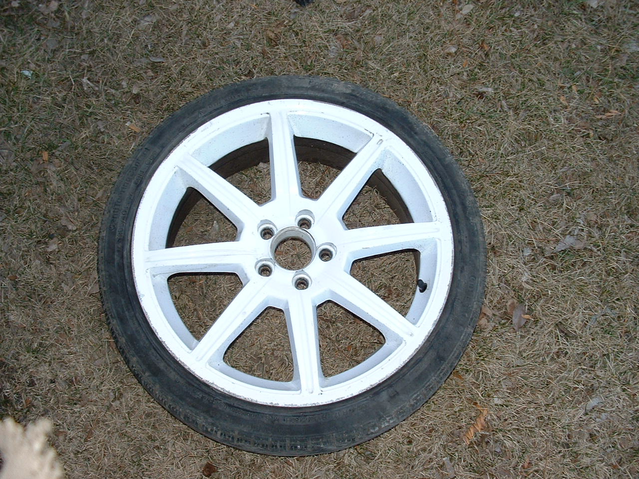 i have a set of 17" rims and tires.. not sure of the brand but they are white with some curb rash and pitting.. not the best shape but they are straight 2 tires are shot the other 2 are about 30%.. well start it out at $300 or trade for some performance parts.. bolt pattern is 5x100