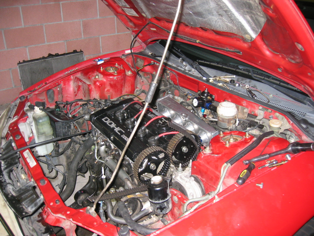 Here is a couple pics before i really started the build. I changed the rims, added a side skirt from my White GST and painted it red, painted the mirrors red as well. The middle picture is me and a couple friends Count the dsms... Also not shown is my white gst which is hiding on the side of my house. Third pic is of the engine bay before the build