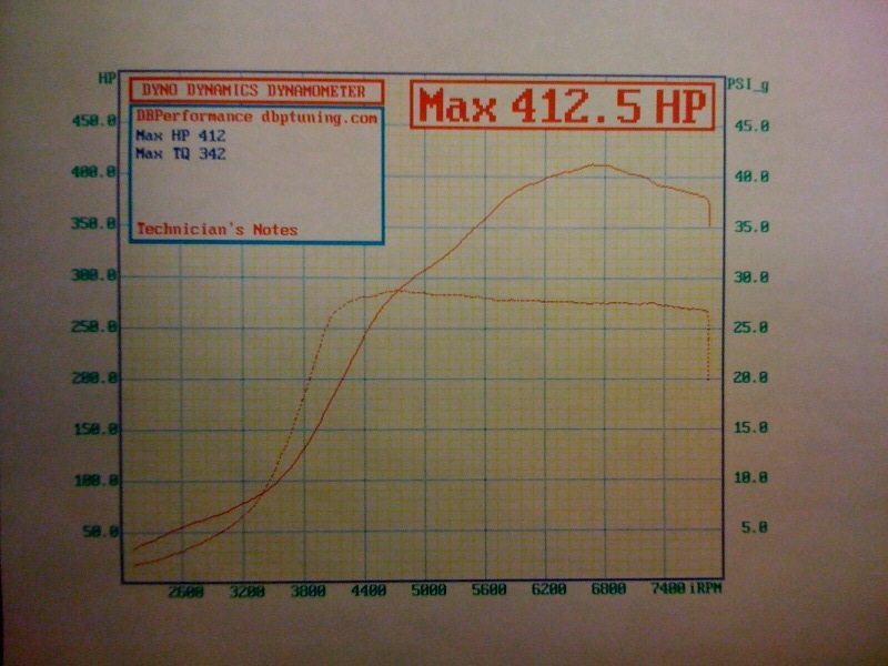 Car made 412awhp @ 28psi at DB where it was tuned, the turbo is pretty much maxed out at that power level. At just 21psi it made 360awhp, so you might be able to make around that much on regular pump gas.