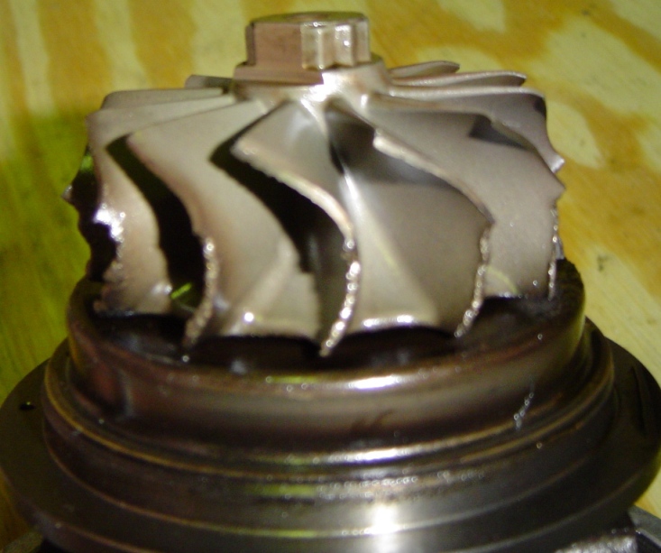 I apologize in advance but you can see from the turbine wheel shots attached that either a piece of a valve, something small was left in the turbine housing during install went through the turbine housing and caused the problems you see in the pictures.