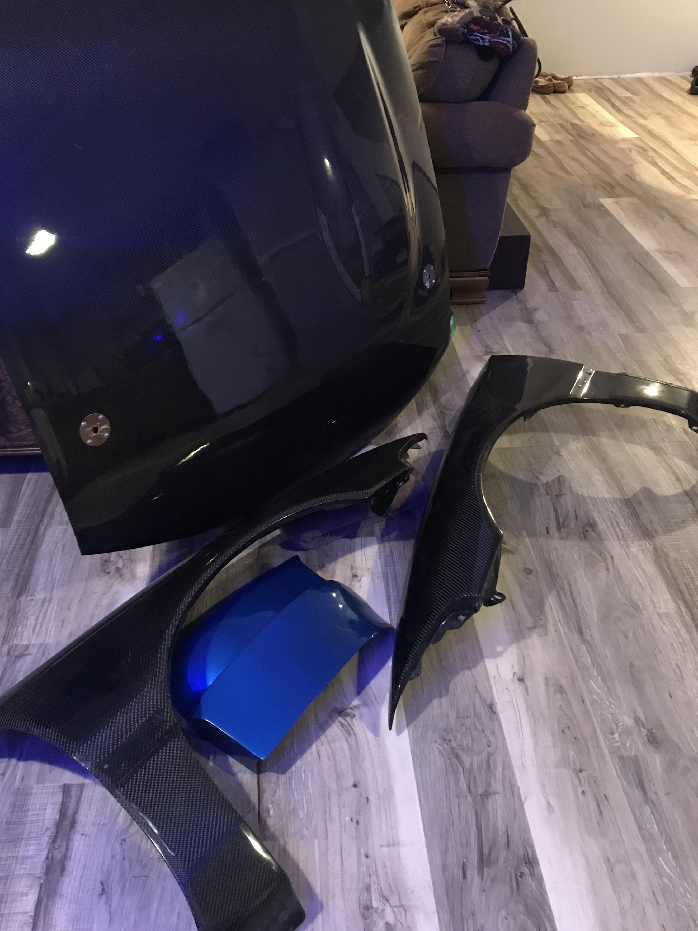 Carbon fiber fenders and hood mounted up. I have to say this color blue and carbon fiber looks so good