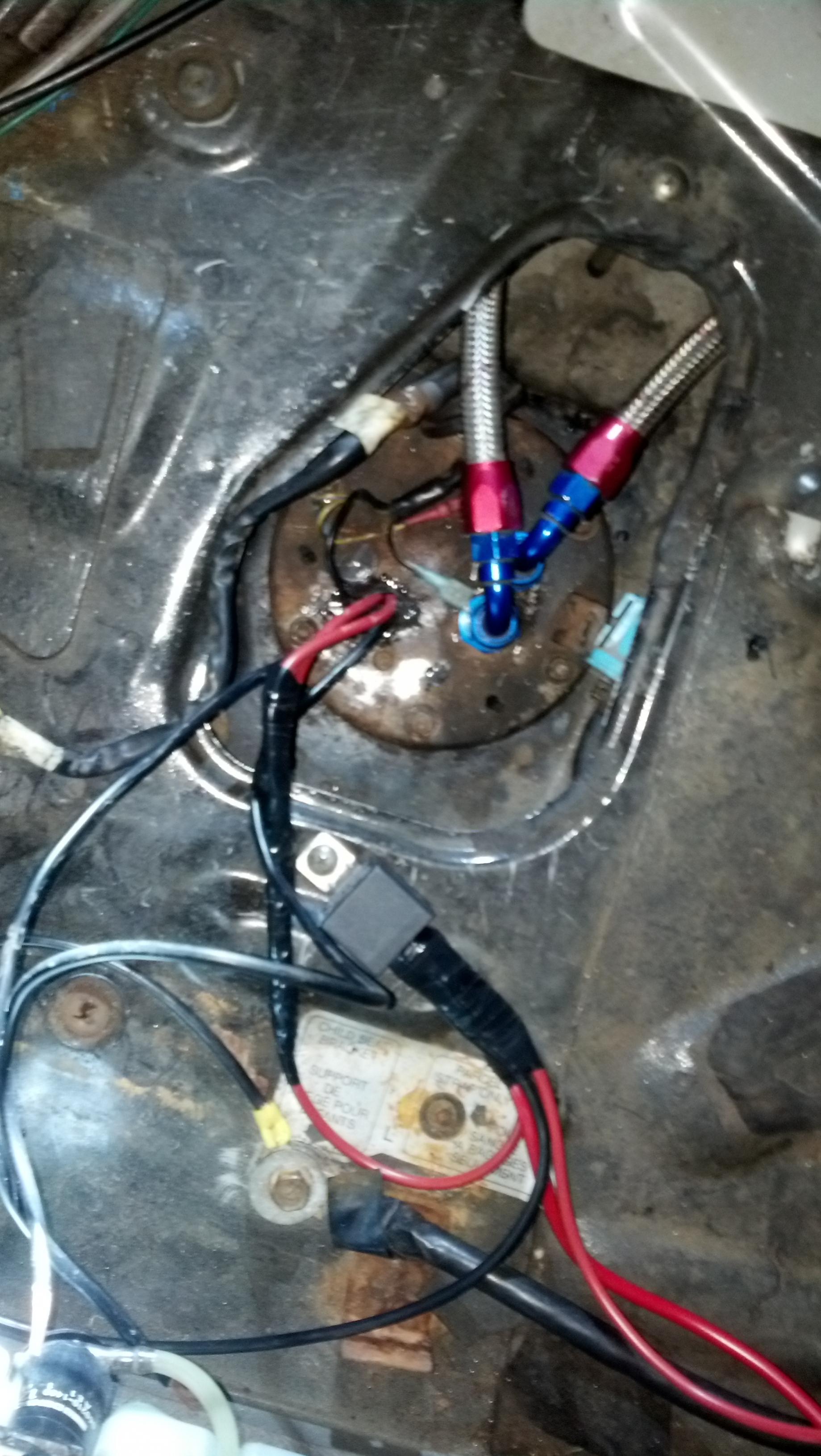 I was feeling kind of ambitious today so instead of buying a full blown pump hanger I decided to rewire mine with 10g wire. I got the stock plastic plug where the stock wires go into the sender out and drilled it bigger then ran then 10g wire in and jb welded it closed. This should help a lot with the voltage drop to the pumps almost all the crimp connectors in the tank were loose and it was 14g wire in the tank. I used crimp connectors to connect them to the pumps but I also soldered them so they can't loosen up. It will also get rid of the multiple connections coming in and out of the sender as well as using the rusty sender as a ground. There are also multiple wire size changes coming into and out of the fuel pump relay. I will be rewiring all of that too so there is a good clean power supply to the pumps.