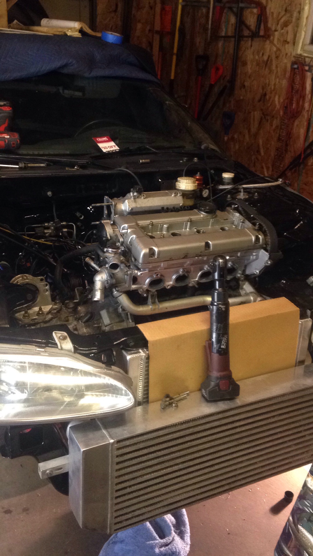 Got it started! Soo loud with only the downpipe on. Running a little rich (it's now on speed density) soo I'll have to lean it out a little. Only one oil leak from the feed line.