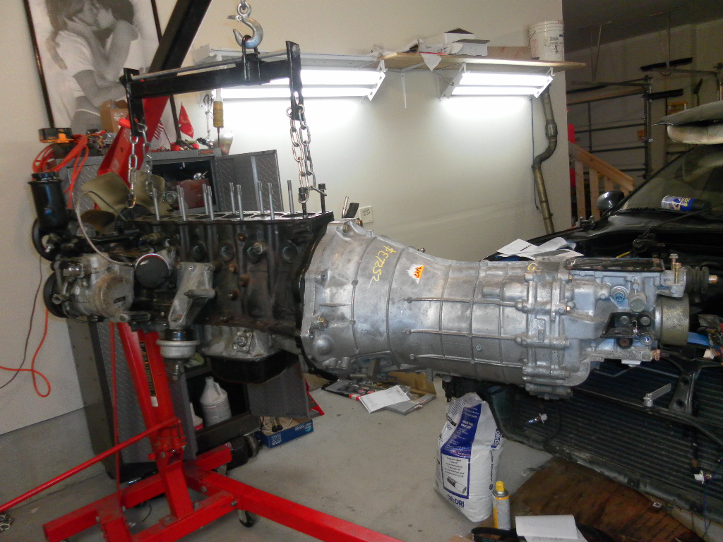 Anyhow, so here she sits. Basically it's just sitting on the 2 stock motor mounts, and I have a floor jack under the car holding up the tail end of the trans. Tomorrow the goal is to mark where the shifter is going to sit so I know where to cut a hole. Once that is done, take it all back out, cut the shifter hole, wait for the head to come back. Assemble and put it all back in. Might need to try and recruit some help for when I put it back in, would make life much easier!