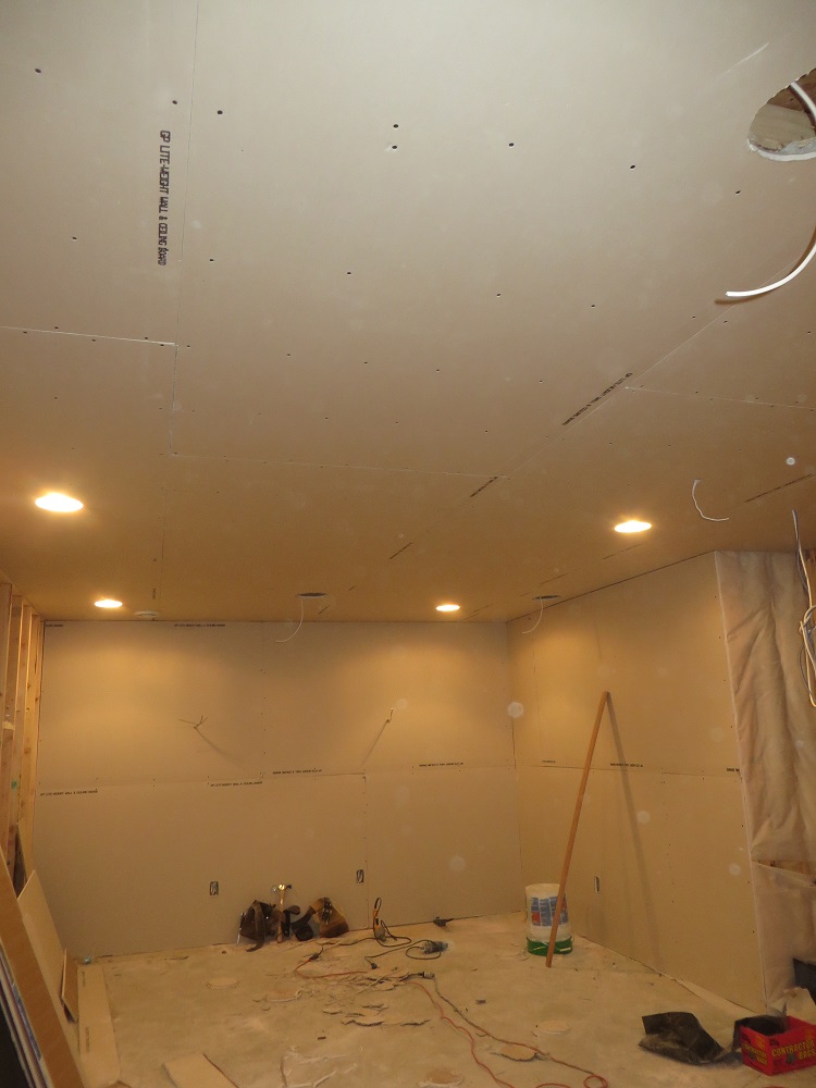Sound board and sheet rock done, great way to end the week. Next week I assume they'll start taping/mudding, install the sconce boxes, install the actual outlets, then who knows what else. If they get to the point where it's ready for paint by the weekend, I may just help him out and paint it myself.