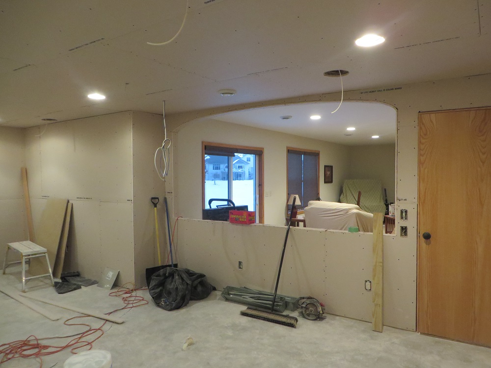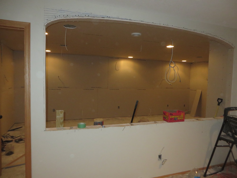 Small update for today. They got the ceiling studs done (ceiling had to come down a hair). Beefed up the half wall for the bar top, and put up some plywood for the archway. Also the Benq and mount showed up today from Amazon.
