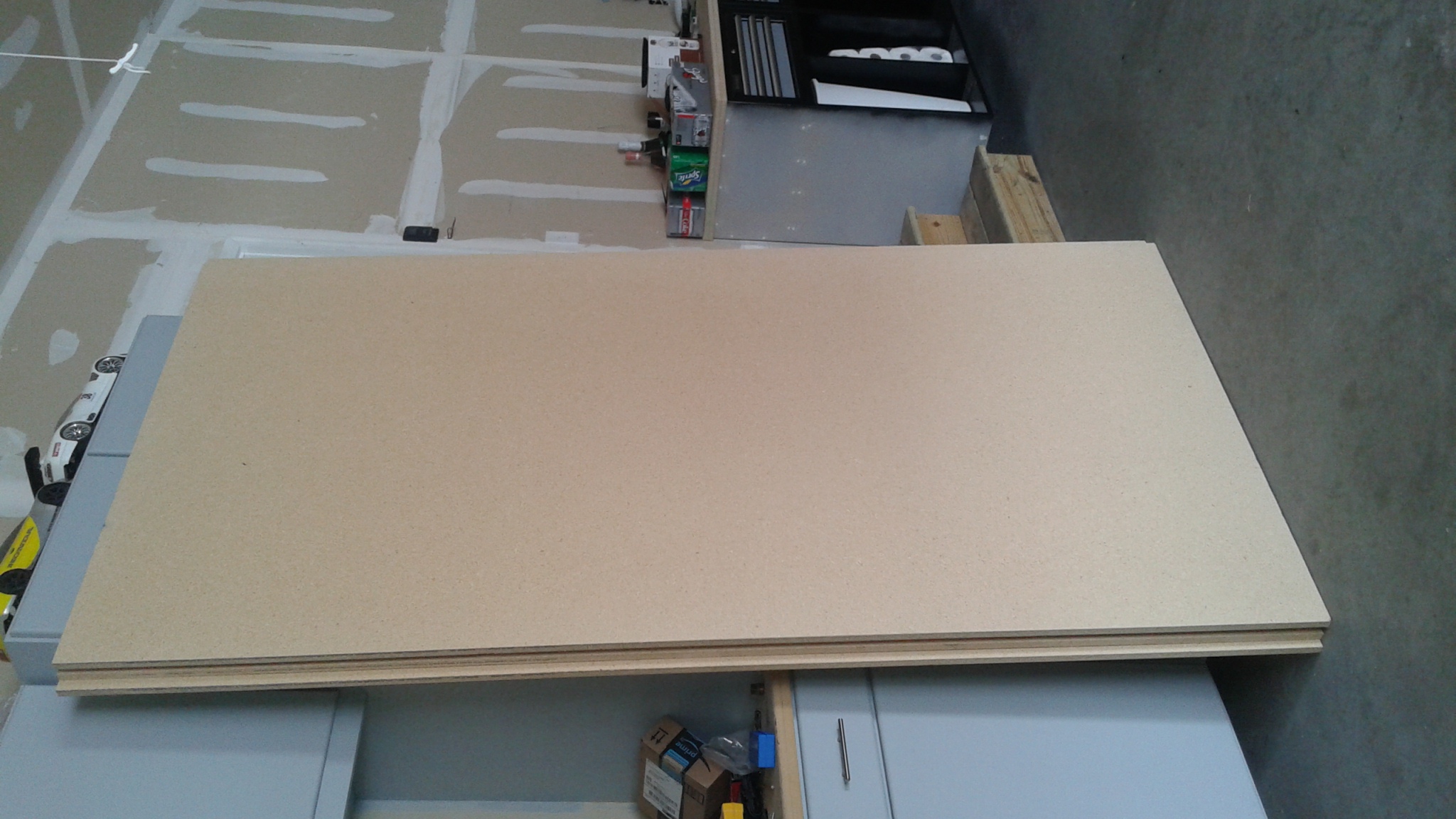 We took his van to Home Depot and picked up four sheets of 3/4" particle board for making the cabinet carcases out of and some other misc supplies (~$120 total). Threw em on his table saw and cut out the pieces to make the initial four lower cabinet carcases. I have them in my garage getting acclimated. Hopefully find some time to start assembling them in the next week or so. Pretty excited to finally start on these!