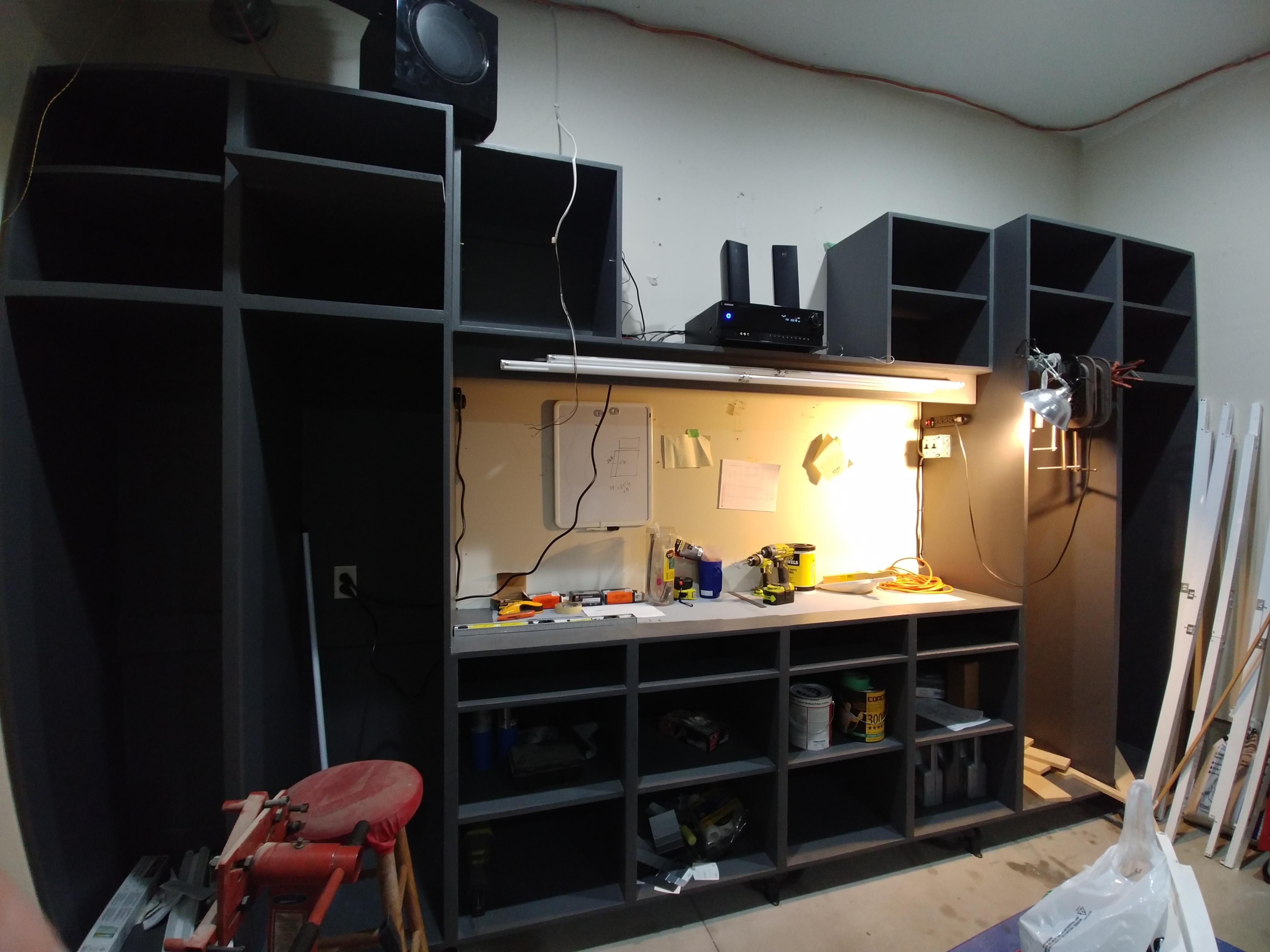 Been working on electrical lately. I have power strips mounted. I have the t5 fixtures mounted. One underneath to light up the work bench surface, and one mounted to shine towards the car for imoroved under hood lighting. Each on their own switch. Still buttoning up that wiring. Also i bought 4 in ceiling soeaker from monoprice ($35/pr). Have our downstairs receiver land sub out therr for testing out. I also bought a used 8" 150w sub off ebay (same as the one im testing out). Hopefully get these ceiling speakers mounted and wired soon. I can fit a max 43" flat screen on the shelf, so im just keeping an eye out for some kinda smokin open box deal at best buy for a 40-43" smart tv (hoping for something around $150).