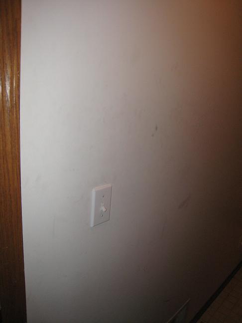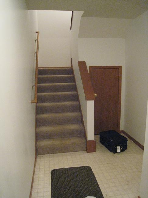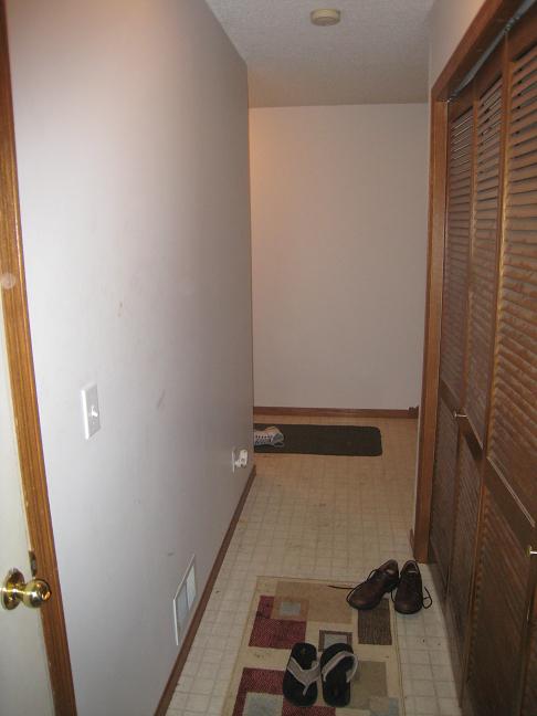 Here is what the entry way looks like right now. As you can see, it's livable, but kinda ugly. The floor is starting to peel up at some of the seams slightly. The walls are covered in dirty finger prints. The light fixtures look like butt.