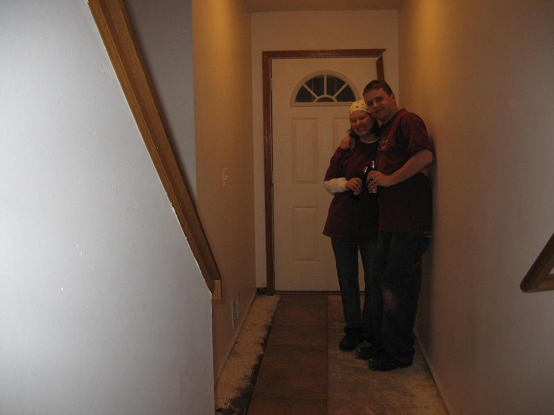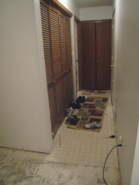 I spent the day ripping the tile up out of the kitchen and patching up the walls in the bathroom (damn wallpaper ripping off paint) at the Fridley house. I finally got the new one in working order. I will be painting the bathroom tomorrow and sealing the slate. I got a nice surprise when taking up the tile in the kitchen, they put it down with thinset cement right on the plywood. I figured they might have. That will be a blast to get off so the hardwoods can go down.