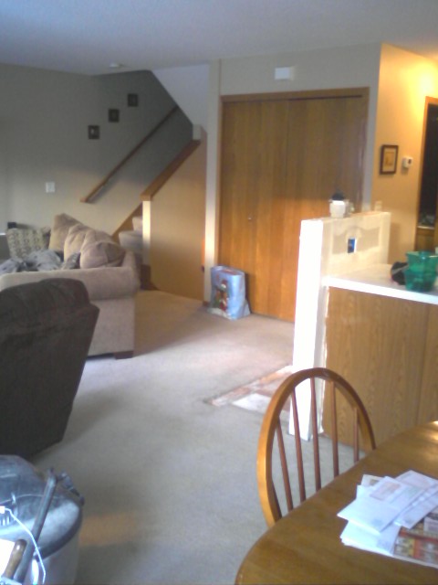 So I decided to get cracking on my main level. Already have the new appliances as I mentioned earlier (fridge, stove, microwave, dishwasher, clothes washer/dryer). So now the first step is to replace the kitchen flooring that is trash. I had a bunch of Home Depot gift cards, so I just went and bought a bunch of Light Oak Pergo flooring that will be going in the kitchen/bath/laundry. Also I am eliminating one cupbard spot. Reason for that is the way it's setup right now makes the dining room huge, and the TV/couch area small. Moving that end over one cupbard spot will help eliminate that. Then once the counter is modified, and the flooring is in, I'm going to get the whole room and the stairway coming up to the main floor re-carpeted.